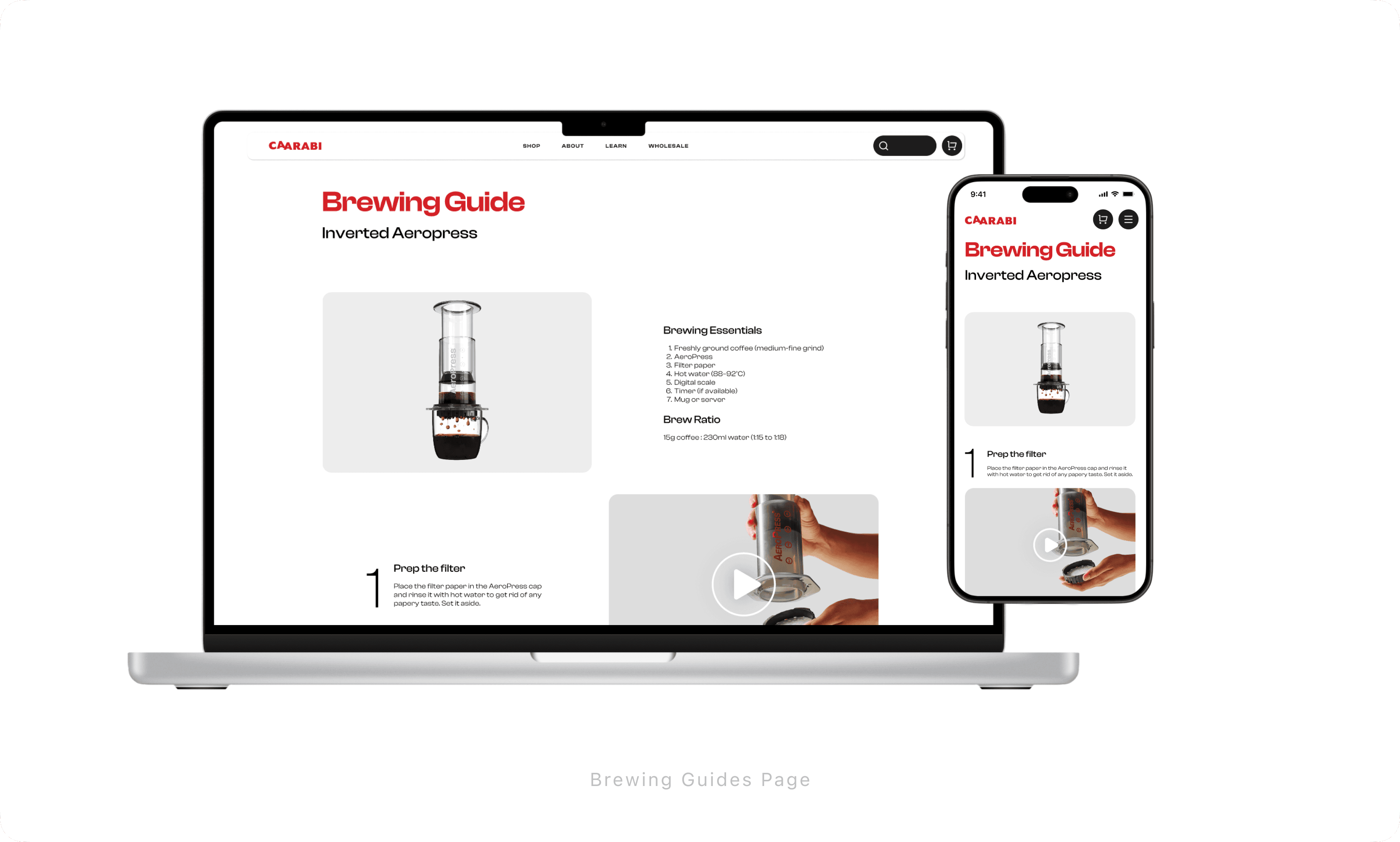 The brewing guide page, absent in the old site, shows we care about users by being helpful and inviting. A clean grid, clear hierarchy, and step-by-step flow remove clutter and make instructions effortless to follow. Numbering, imagery, and video integration turn complex tasks into simple actions